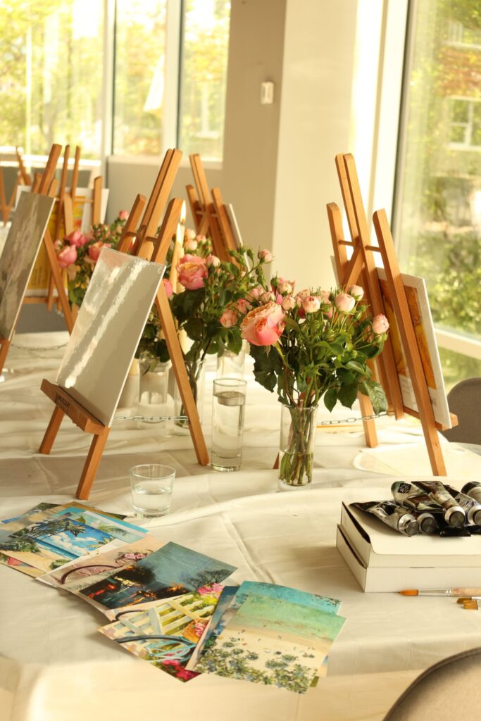 Fie că nu ai ținut niciodată o pensulă în mână sau ai experiență în pictură, masterclass-urile noastre sunt gândite ca o pauză artistică pentru minte și suflet. Într-un mediu relaxat, cu muzică bună, culori vibrante și un pahar de vin, te ghidăm pas cu pas în crearea propriei opere de artă.